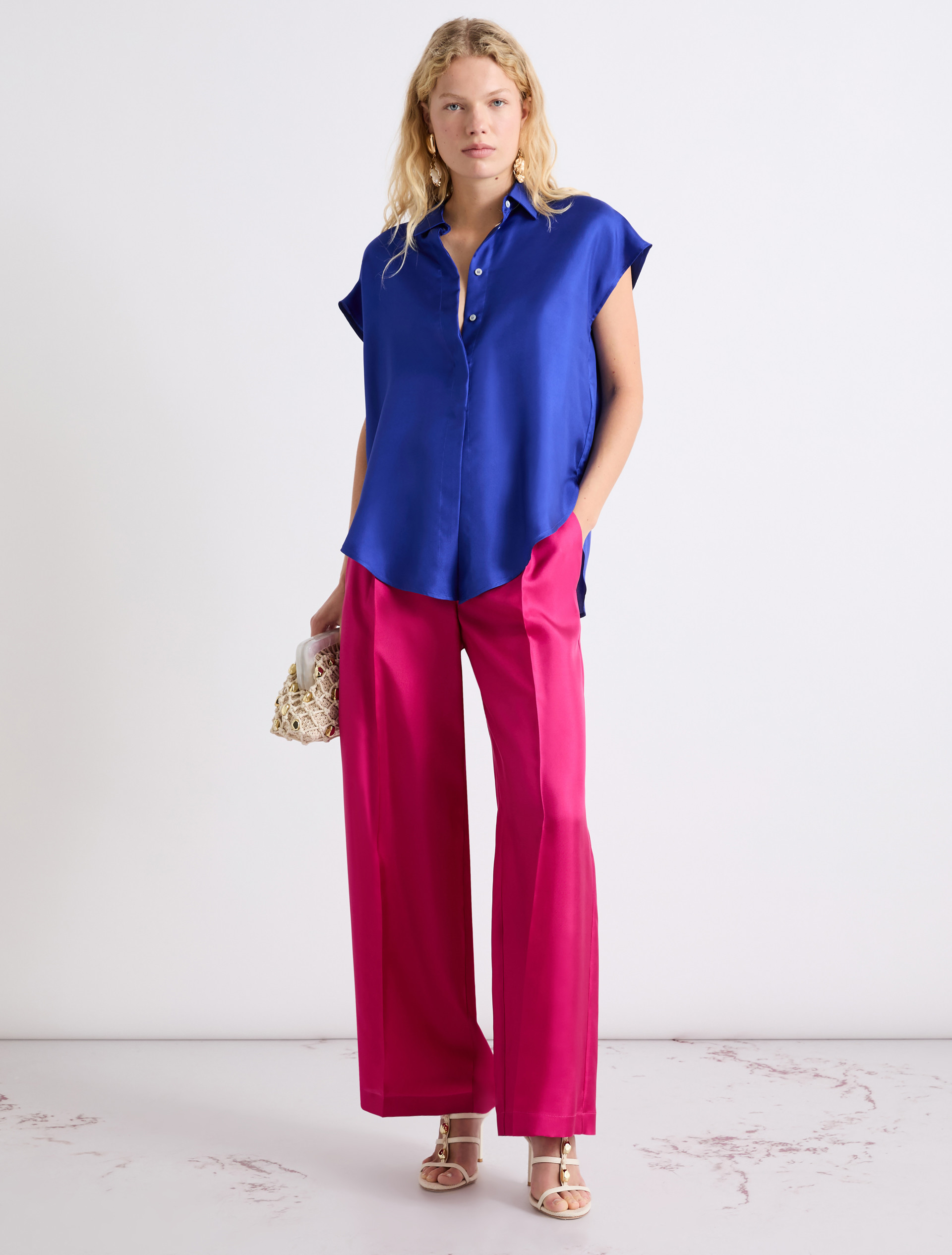 Féminine, éclatante, lumineuse : la nouvelle chemise en sergé de soie capte la lumière et la réinterprète dans les nuances intenses de la saison. Fermée par un nœud à la taille, elle met en valeur la silhouette dans un jeu de volumes inspiré de l’esthétique des années 80.
