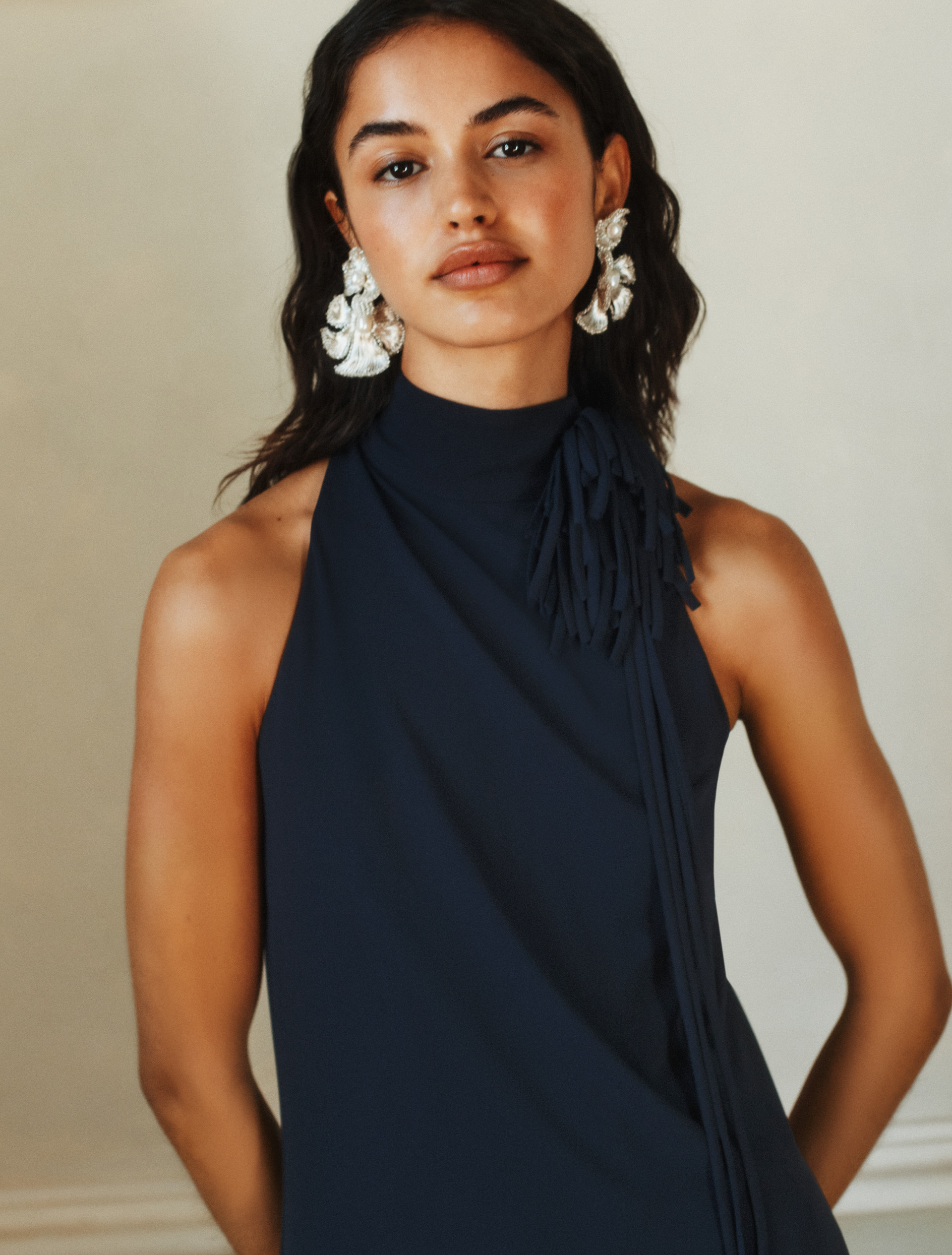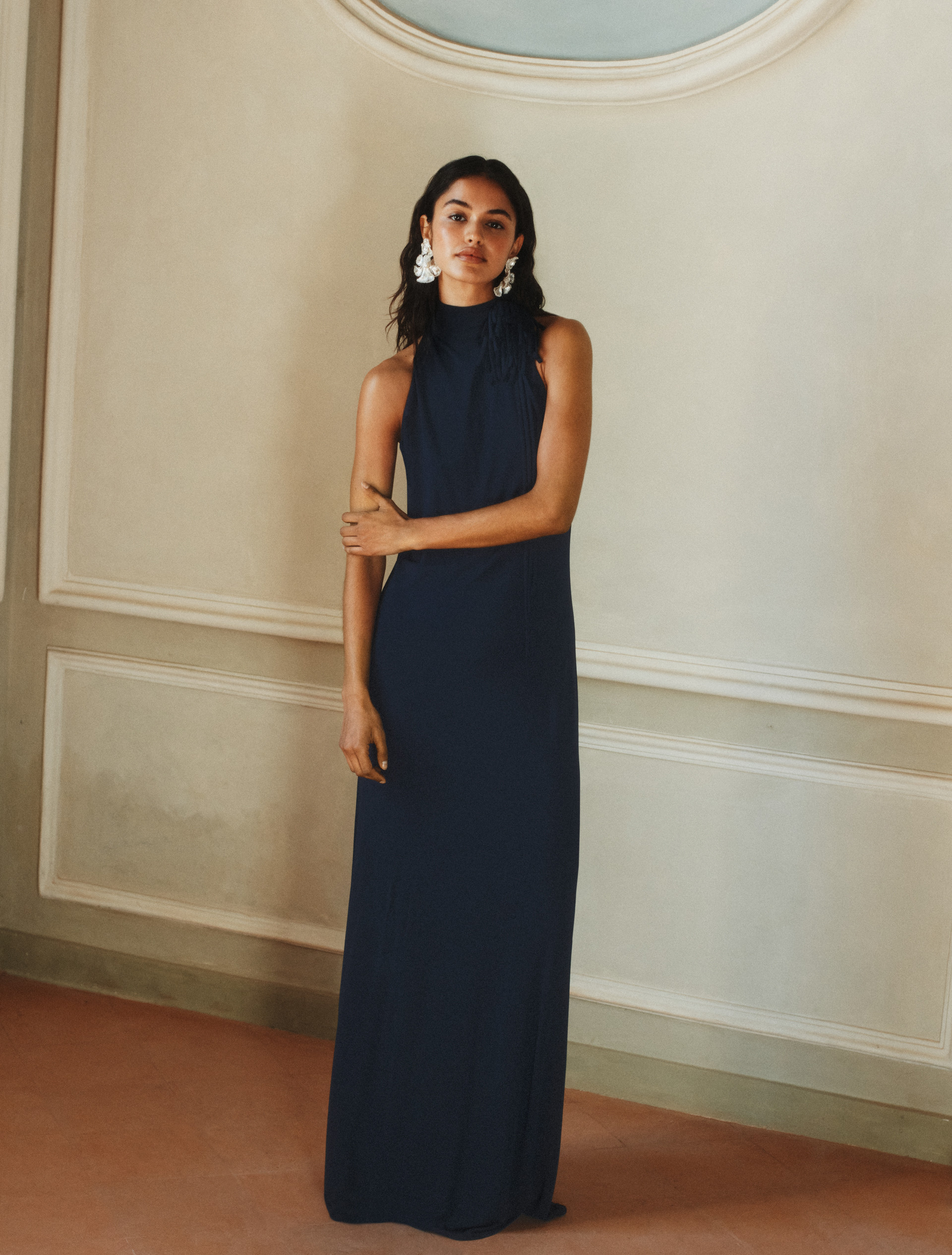 Ajustée et longue, la robe en jersey met en valeur la silhouette et confère un charme élégant. La broche fleurie assortie peut être ajoutée à l’encolure, pour une note romantique et personnalisée.