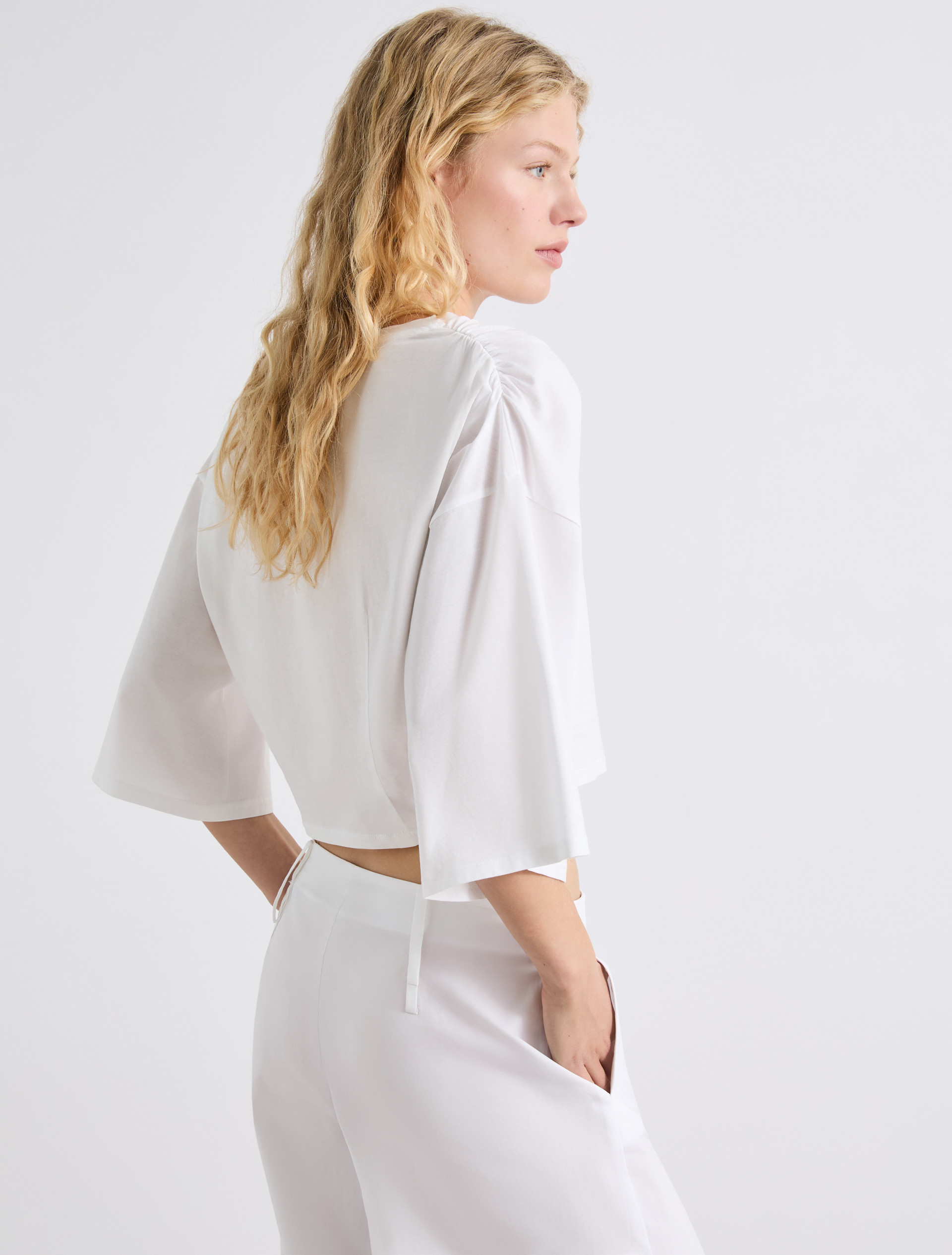 Le t-shirt boxy, dans une version moderne : le doux jersey est froncé sur les épaules pour créer du mouvement, tandis que les pinces arrière resserrent légèrement le volume dans le bas.